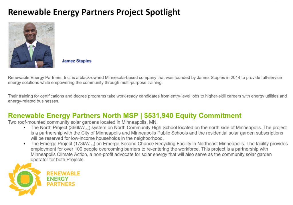 USBCDC invested nearly $400,000 in Tax Credit equity for two North Minneapolis projects Renewable Energy Partners has installed – rooftop solar gardens at North Community High School and Emerge Second Chance Recycling facility – both providing local, equitable access to clean energy in the low-income community. Power from the North High School project will be sold to the city of Minneapolis and Minneapolis Public Schools, while also reserving up to 80% of energy subscriptions for low-income households in the community. The solar garden at Emerge – a mattress recycling operation that employs individuals overcoming barriers to re-entering the workforce – is in partnership with Minneapolis Climate Action. In addition to supporting the facility’s own energy needs, it’s expected to provide bill credits for the clean, inexpensive power to about 100 local households.